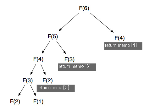 퀵 정렬을 예로 들면, 한 번 기준 원소(Pivot)가 자리를 변경해서 자리를 잡게 되면 그 기준 원소의 위치는 더 이상 바뀌지 않고 그 피벗값을 다시 처리하는 부분 문제는 존재하지 않는다. 반면에 다이나믹 프로그래밍은 한 번 해결했던 문제를 다시금 해결한다는 점이 특징이다. 그렇기 때문에 이미 해결된 부분 문제에 대한 답을 저장해 놓고, 이 문제는 이미 해결이 됐던 것이니까 다시 해결할 필요가 없다고 반환하는 것이다. 예를 들어 재귀 함수를 이용하는 방법(메모이제이션)에서는 한 번 푼 문제는 그 결과를 저장해 놓았다가 나중에 동일한 문제를 풀어야 할 때 이미 저장한 값을 반환한다. f(6) 해법을 다시 메모이제이션 기법을 이용하여 그려보면 6번째 피보나치 수를 호출할 때는 다음 그림처럼 왼쪽(바깥쪽) 노드만 방문하게 된다.