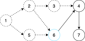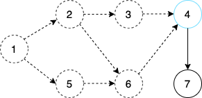 step 6. 그 다음 큐에 들어 있는 노드 4를 꺼낸다. 이제 노드 4와 연결되어 있는 간선을 제거한다. 그러면 새롭게 노드 7의 진입차수가 0이 된다. 따라서 노드 7을 큐에 삽입한다.