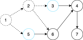 step 1. 먼저 큐에 들어 있는 노드 1을 꺼낸다. 이제 노드 1과 연결되어 있는 간선들을 제거한다. 그러면 새롭게 노드 2와 노드 5의 진입차수가 0이 된다. 따라서 노드 2와 노드 5를 큐에 삽입한다. 처리된 노드와 간선은 점선으로 표기하겠다.