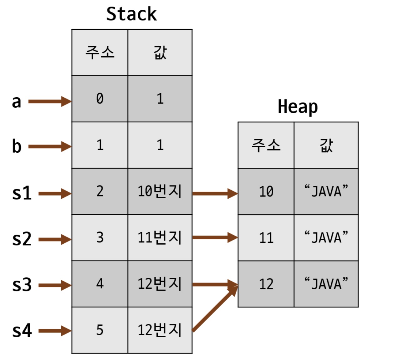 즉 == 연산자는 변수가 일차적으로 가리키고 있는 메모리 공간의 값을 기준으로 판단한다. s1, s2, s3(s4) 변수는 일차적으로 각각 10번지, 11번지, 12번지라는 주소를 가리키고 있기 때문에 서로 == 연산자를 이용하면 false라고 연산하게 된다.