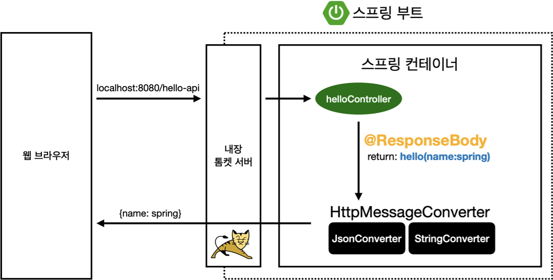 @ResponseBody의 사용 원리는 다음과 같다. 웹 브라우저에서 localhost:8080/hello-api를 입력하면, 톰캣 내장 서버에서 "hello-api가 왔어" 하면서 스프링에 던진다. 그러면 스프링은 "hello-api가 있네. 그런데 @ResponseBody라는 어노테이션이 붙어있네" 한다. @ResponseBody가 붙어있지 않으면 스프링은 viewResolver에게 던진다. 그런데 @ResponseBody가 있으면 http 응답에 그대로 데이터를 넘긴다.