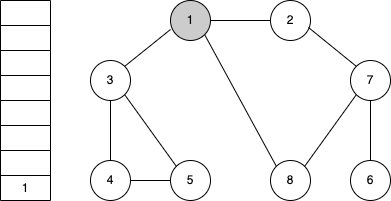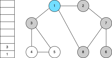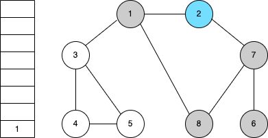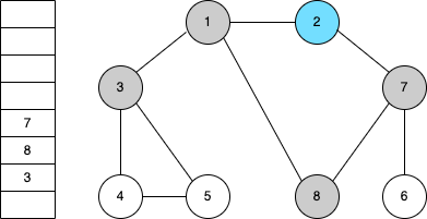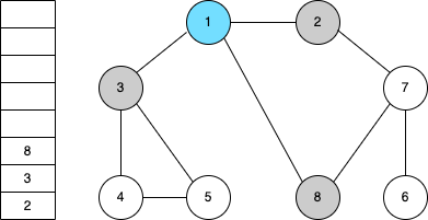 step 2. 큐에서 노드 '1'을 꺼내고 방문하지 않은 인접 노드 '2', '3', '8'을 모두 큐에 삽입하고 방문 처리를 한다.