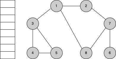 BFS를 이용하여 탐색하면 그 과정은 다음과 같다. 마찬가지로 인접한 노드가 여러 개 있을 때, 숫자가 작은 노드부터 먼저 큐에 삽입한다고 가정한다. 다음 그림에서 큐에 원소가 들어올 때, 위에서 들어오고 아래쪽에서 꺼낸다고 가정하자.