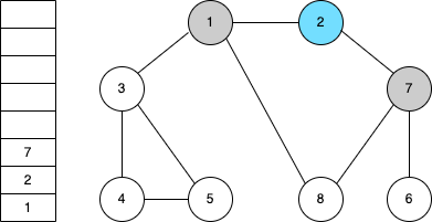step 9. 스택의 최상단 노드인 '2'에 방문하지 않은 인접 노드가 없다. 따라서 스택에서 '2'번 노드를 꺼낸다.