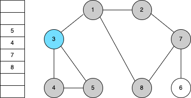 step 4. 큐에서 노드 '3'을 꺼내고 방문하지 않은 인접 노드 '4'와 '5'를 모두 큐에 삽입하고 방문 처리를 한다.