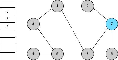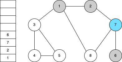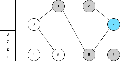 step 8. 스택의 최상단 노드인 '7'에 방문하지 않은 인접 노드가 없다. 따라서 스택에서 '7'번 노드를 꺼낸다.