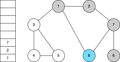 step 7. 스택의 최상단 노드인 '8'에 방문하지 않은 인접 노드가 없다. 따라서 스택에서 '8'번 노드를 꺼낸다.