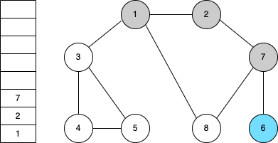 step 4. 스택의 최상단 노드인 '7'에 방문하지 않은 인접 노드 '6'과 '8'이 있다. 이 중에서 가장 작은 노드인 '6'을 스택에 넣고 방문 처리를 한다.
