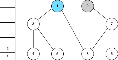 step 2. 스택의 최상단 노드인 '1'에 방문하지 않은 인접 노드 '2', '3', '8'이 있다. 이 중에서 가장 작은 노드인 '2'를 스택에 넣고 방문 처리를 한다.