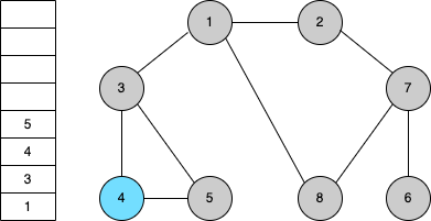 step 11. 스택의 최상단 노드인 '3'에 방문하지 않은 인접 노드 '4'와 '5'가 있다. 이 중에서 가장 작은 노드인 '4'를 스택에 넣고 방문 처리를 한다.